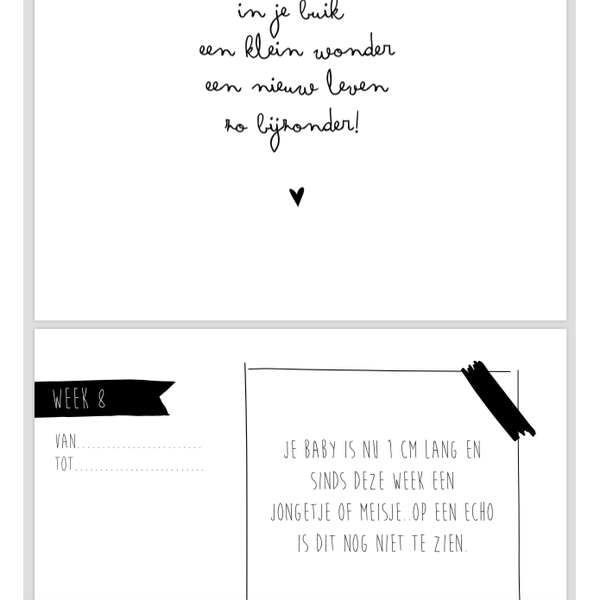 In dit negen maanden boek kun je alle mijlpalen en gebeurtenissen van je zwangerschap bijhouden. Van je echo foto's tot je buikomtrek.