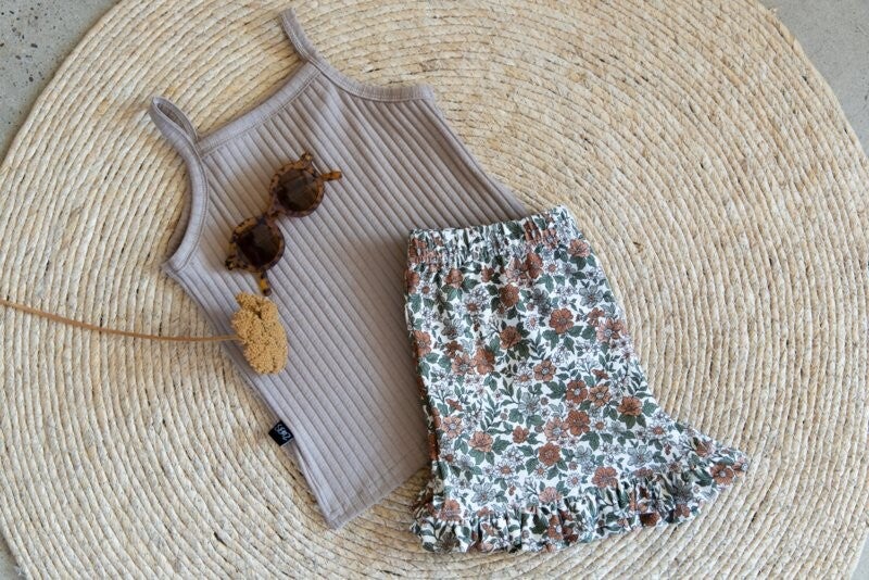 Een mooi broekje met bloemen print en ruffles aan de onderkant.