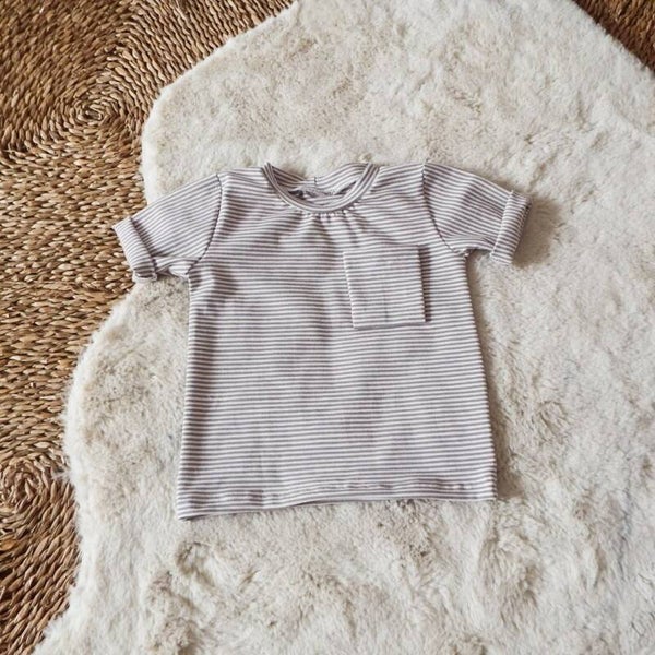 Een gestreept T-shirt met een zakje op de linkerborst.