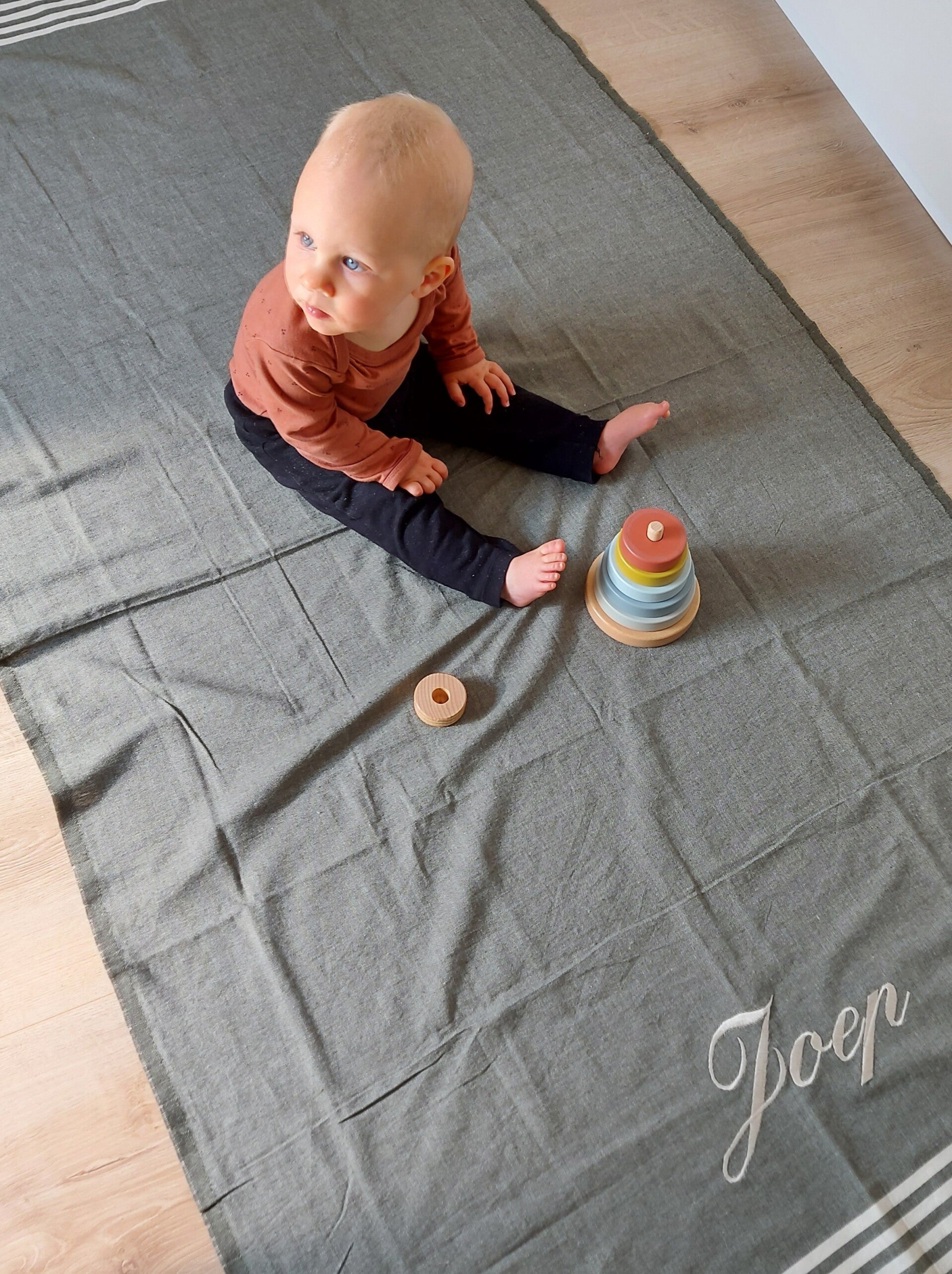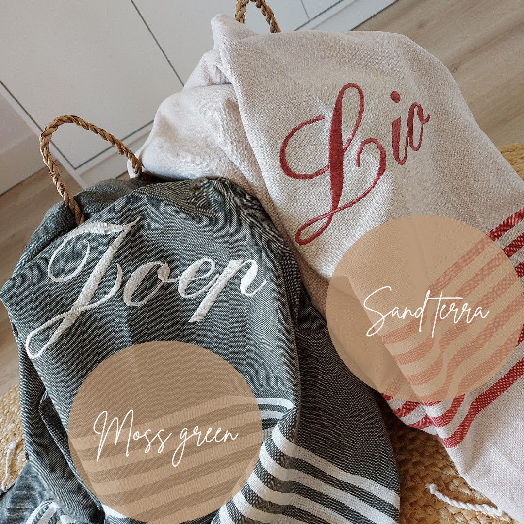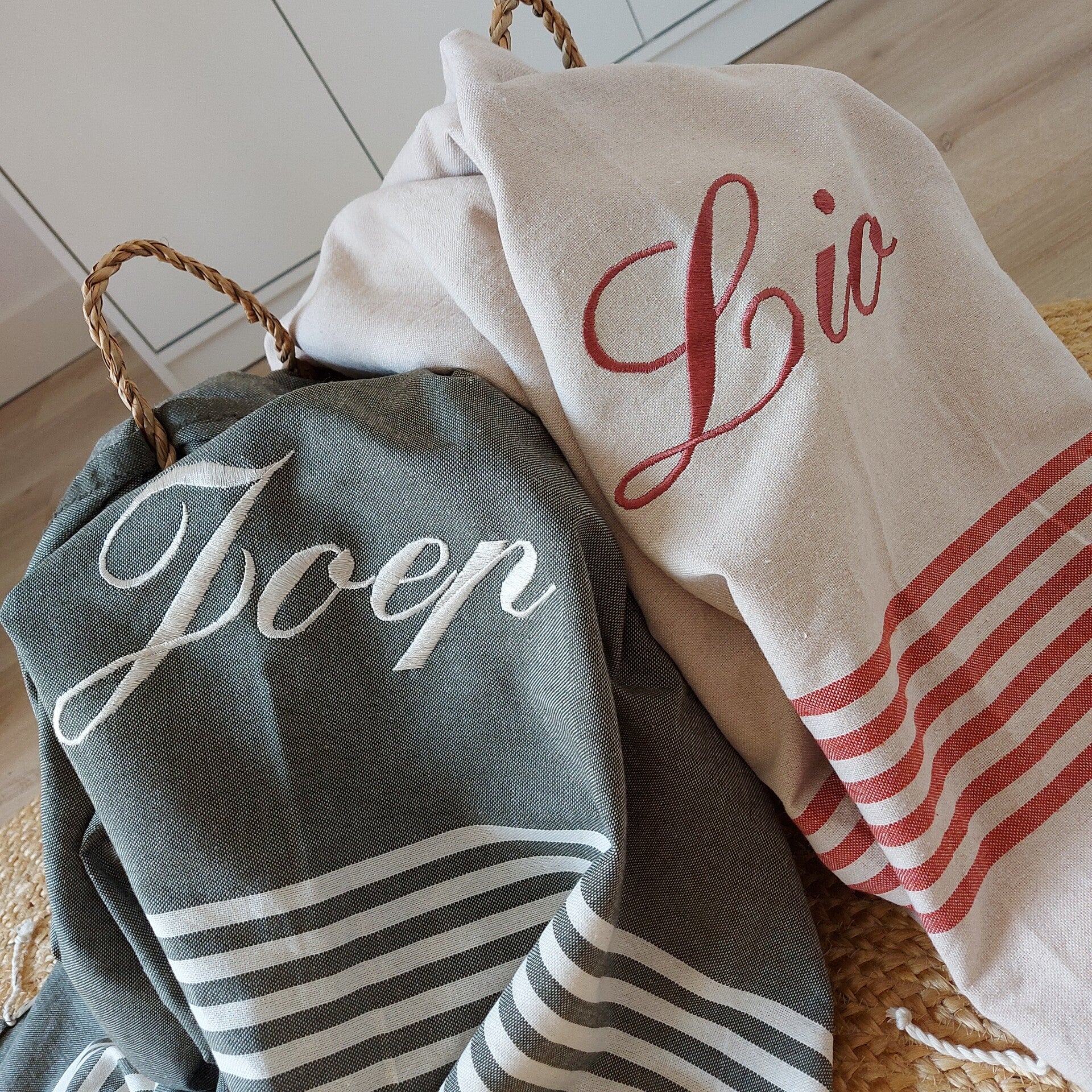 Mombacare introduceert deze duurzame gepersonaliseerde strandlakens met naam. Gemaakt van 100% katoen, waardoor ze snel drogen. De doek heeft aan beide korte kanten 6 ingeweven streepjes en is afgewerkt met ecru kleurige handgevlochten franjes.